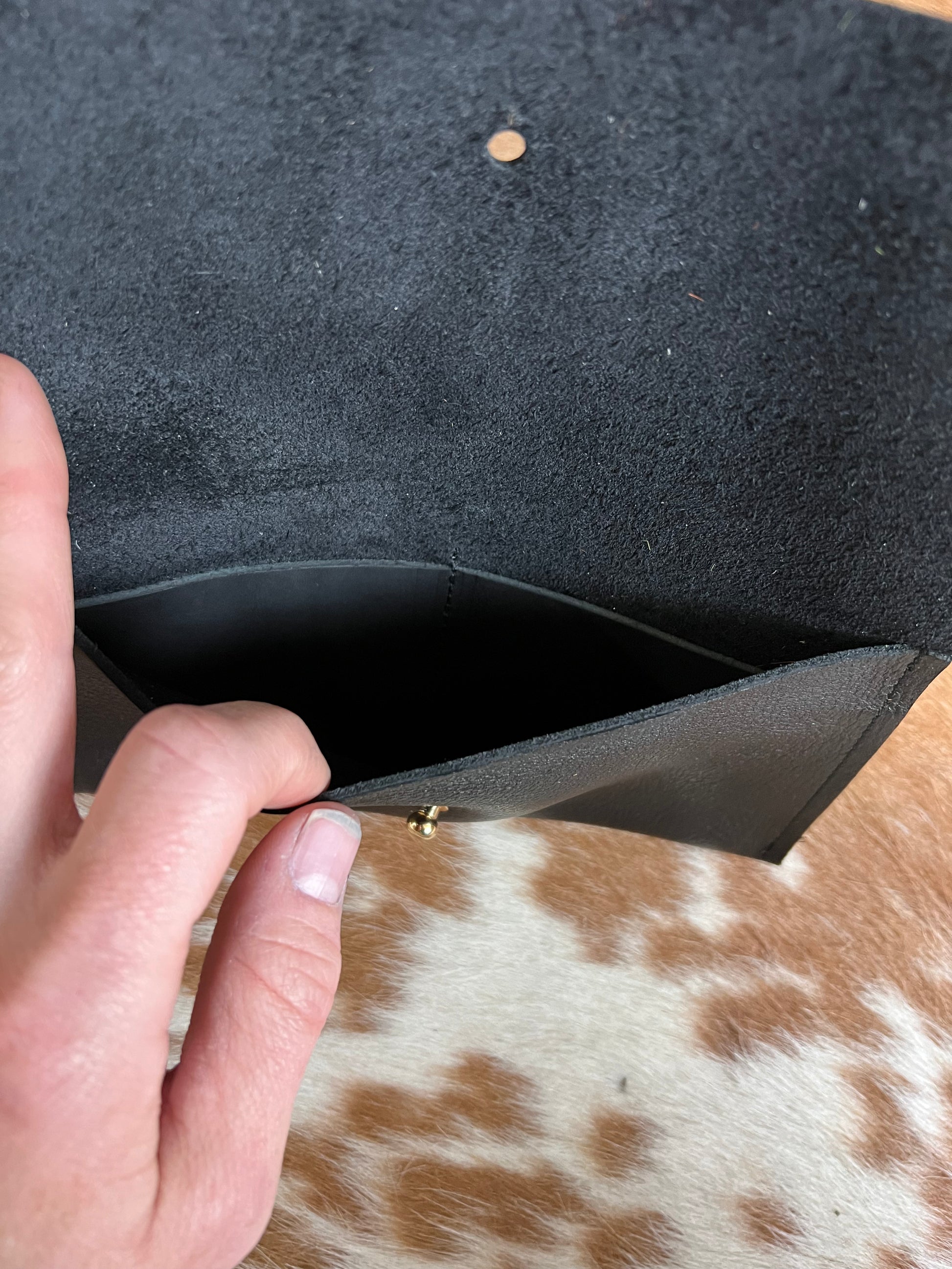 Two roomy card pockets inside made with coordinating leather