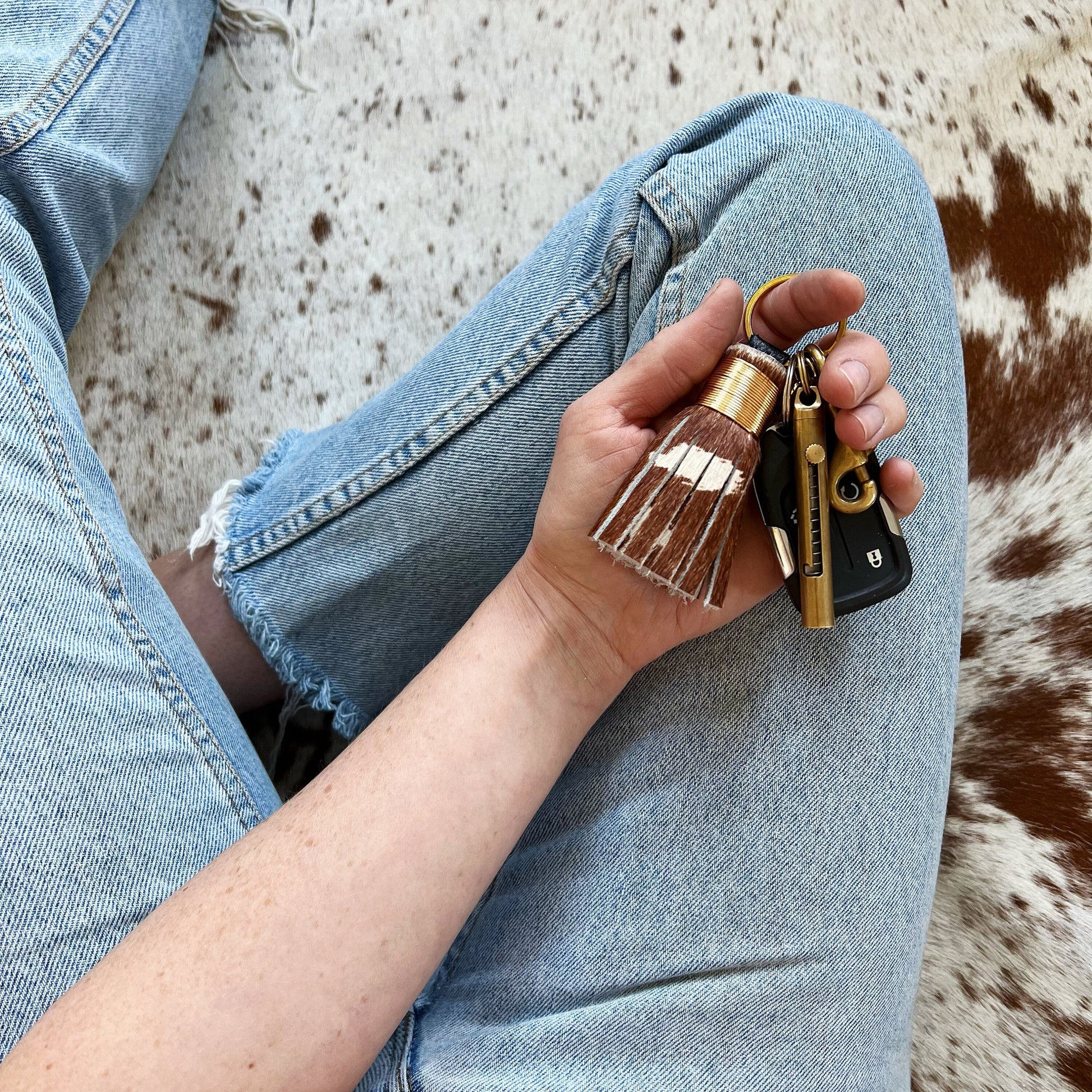 Mini Axis Deer Printed Cowhide Tassel Keychain - Hair on Hide Leather