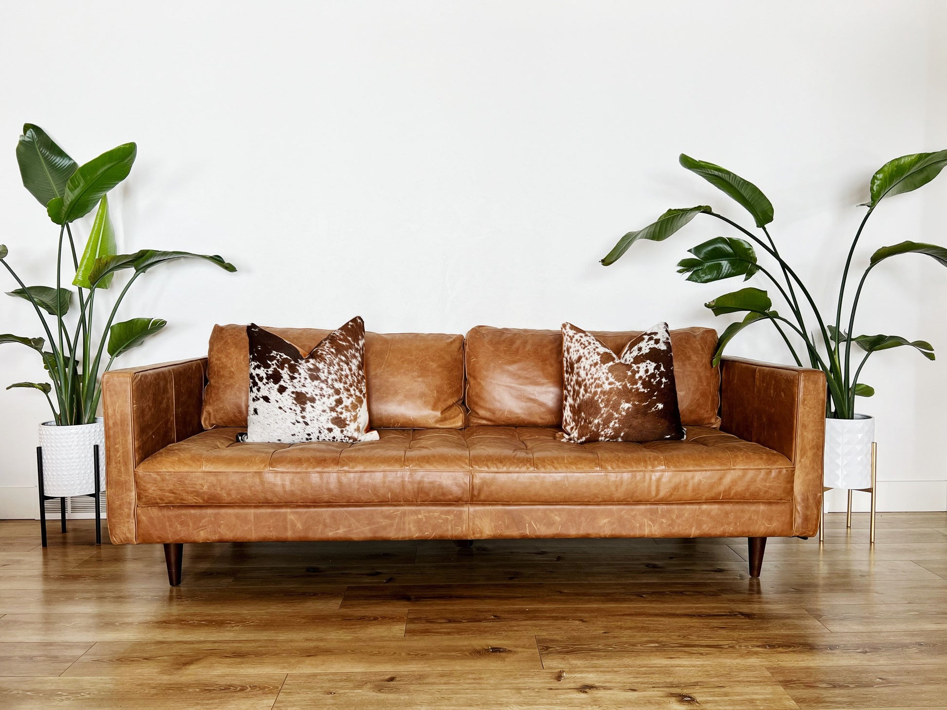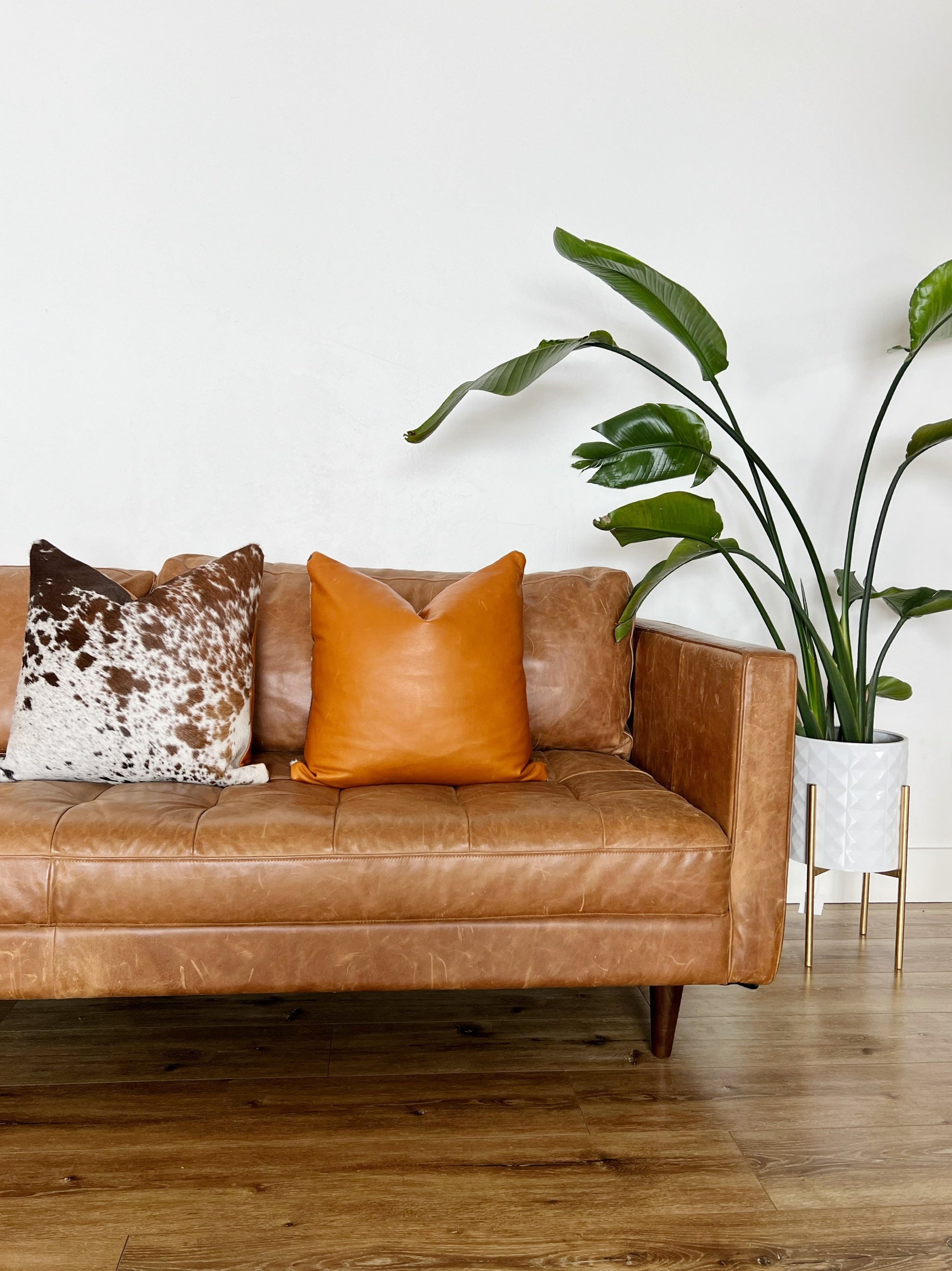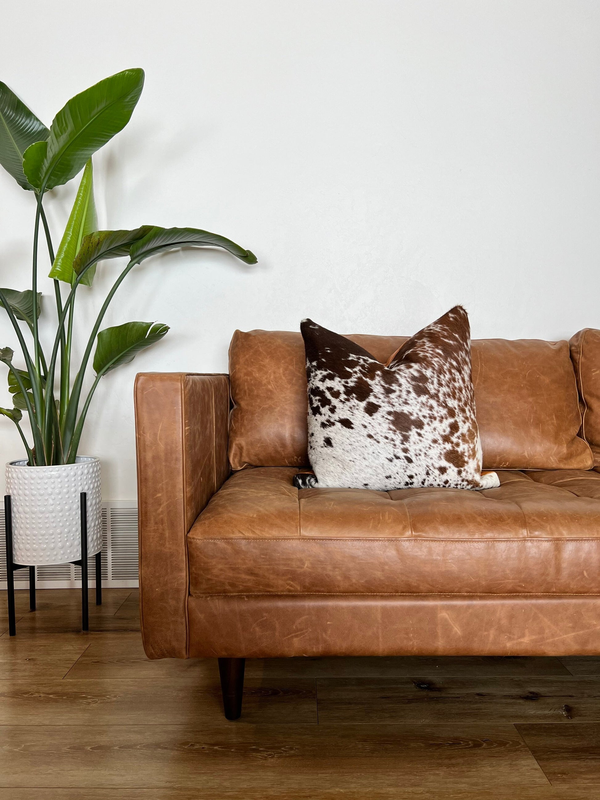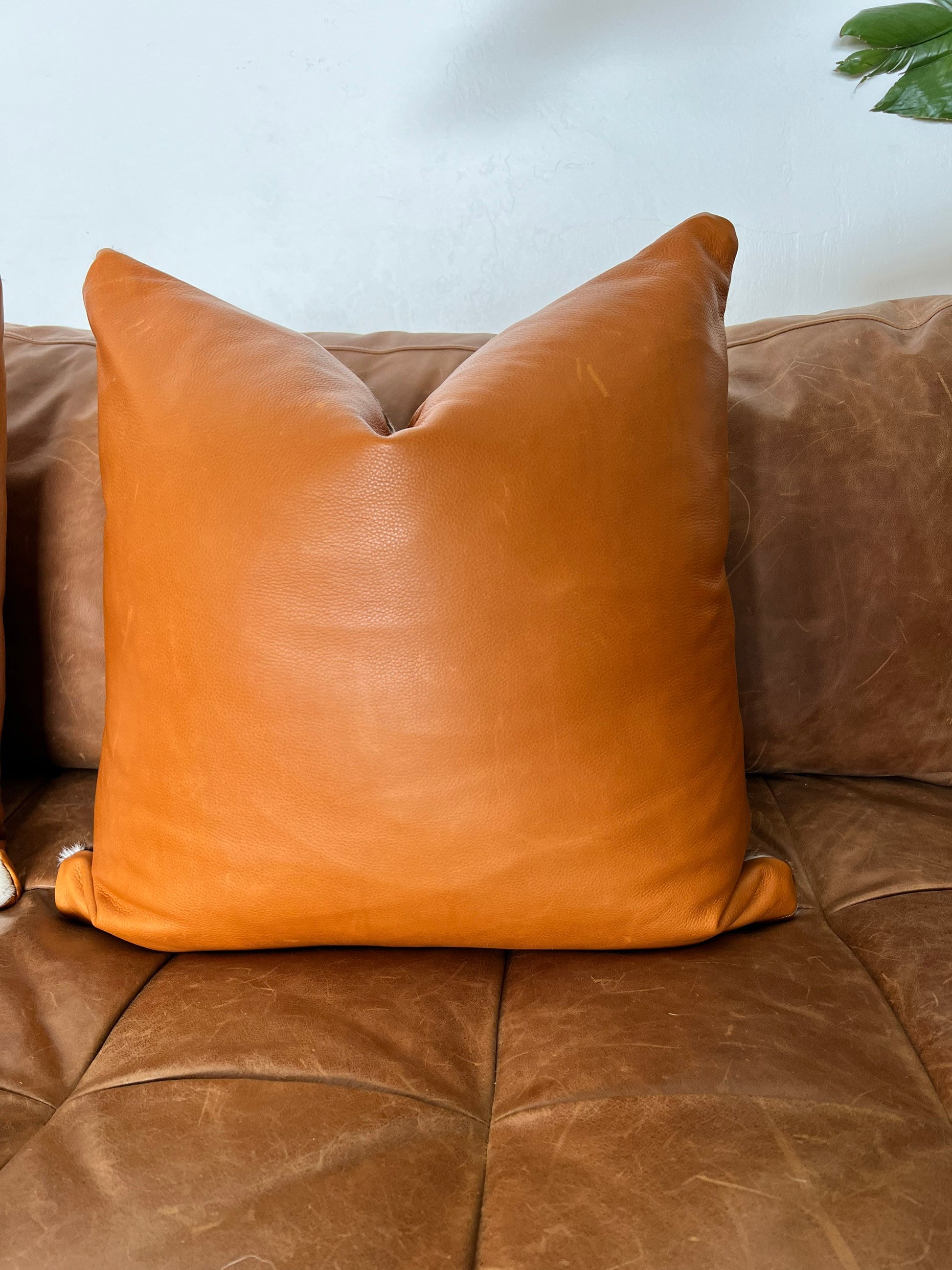The front side of the pillows is genuine, designer quality, cowhide, and the back side is top grain, buttery smooth, leather. The leather side will show marks and scratches that can be buffed or rubbed out easily. This is the nature of top grain leather and is NOT a flaw (it’s how you know it’s GOOD leather!! :))