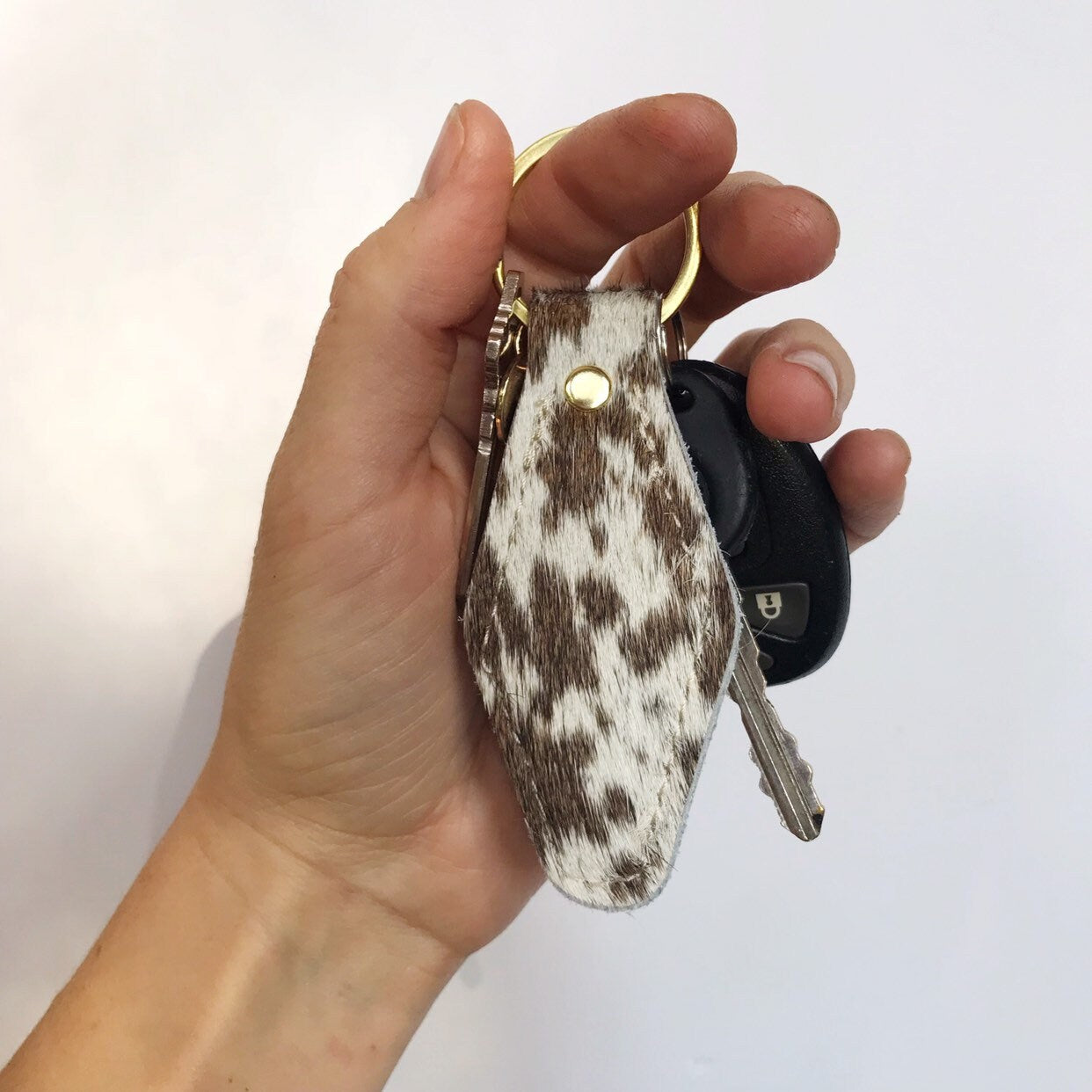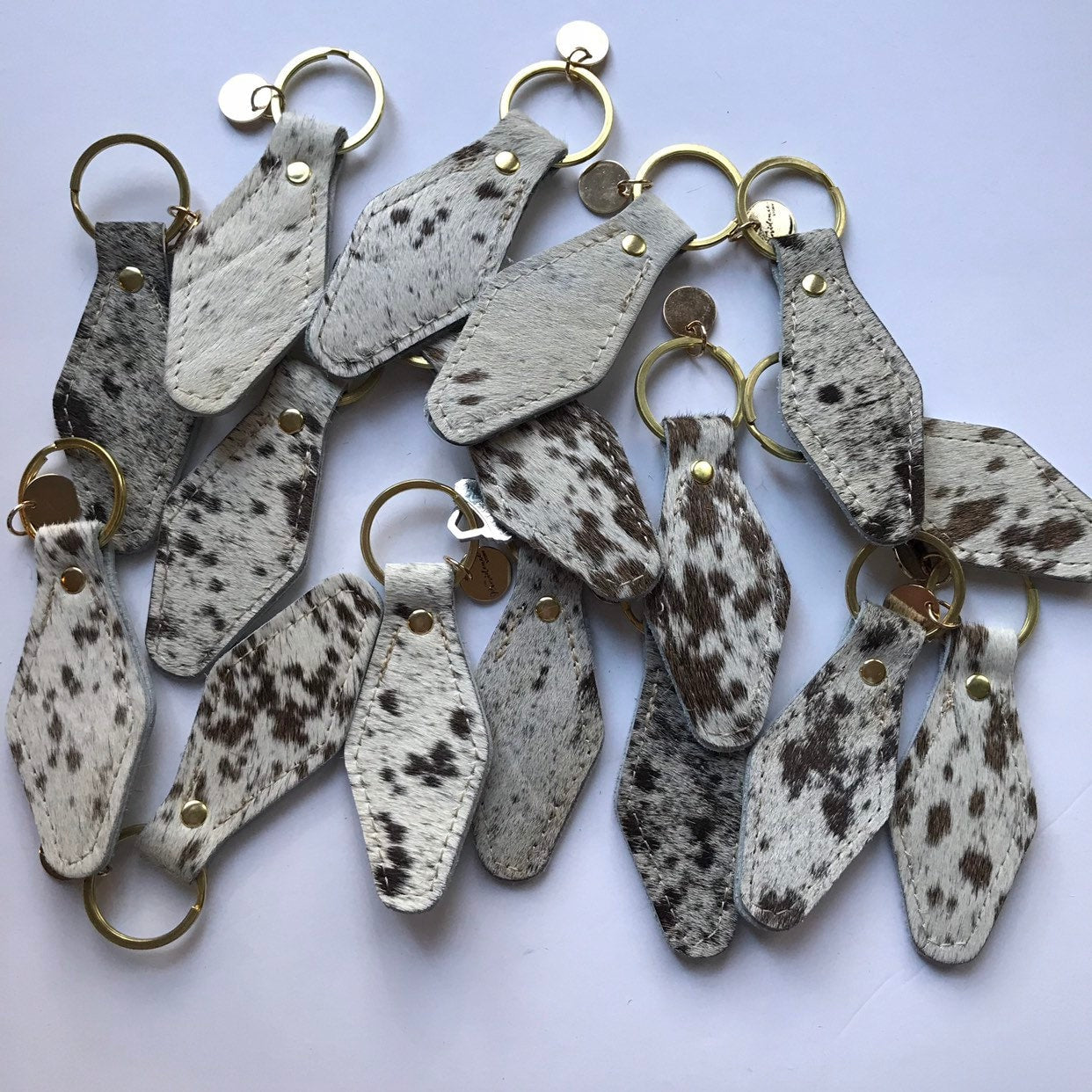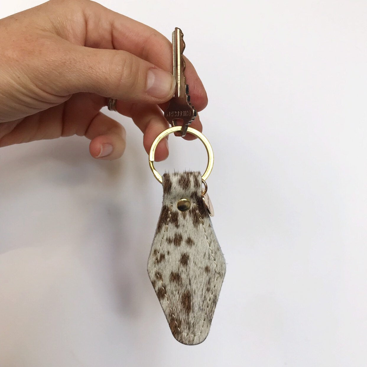 Speckled White Cowhide Hair on Hide Leather Retro Motel Keychain